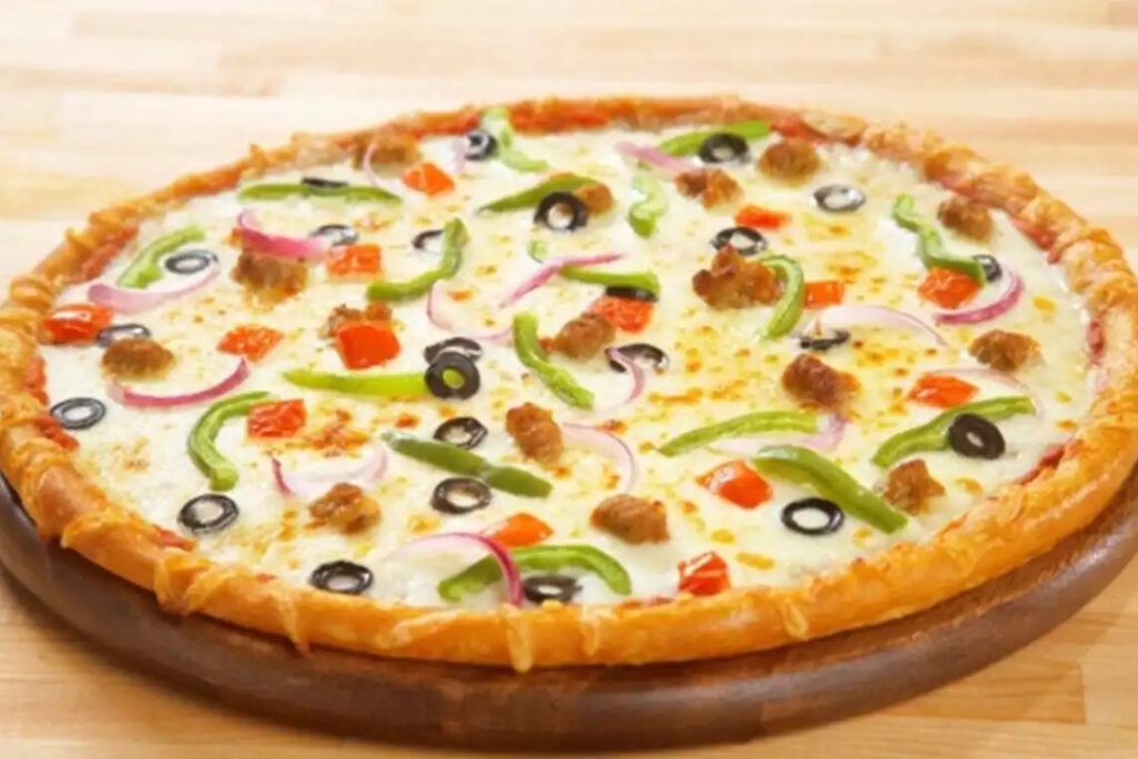 Our supreme pizza is loaded with pepperoni, sausage, onions, bell peppers, mushrooms, and olives —…