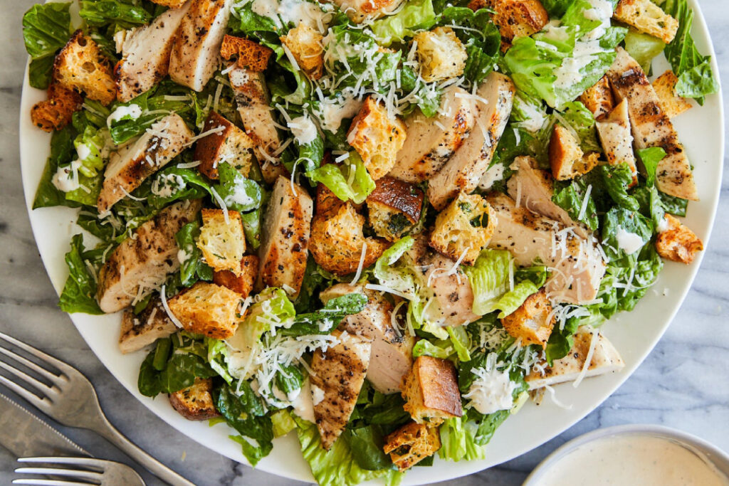Romaine lettuce tossed with Caesar dressing, croutons, Parmesan cheese, and grilled chicken.