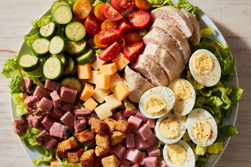 A classic favorite—sliced turkey and ham, sharp cheddar cheese, hard-boiled egg, cucumbers, and tomatoes over a bed of fresh mixed greens. Served with your choice of dressing.
