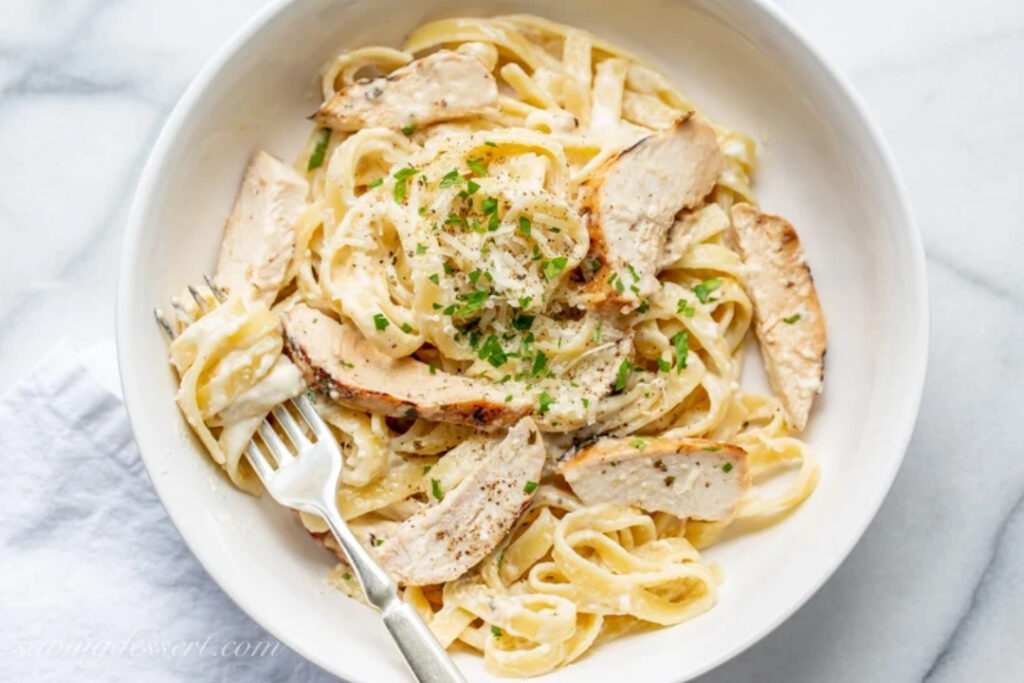 Slow-cooked chicken served over fettuccine noodles, tossed in our made-to-order creamy garlic Alfredo sauce.