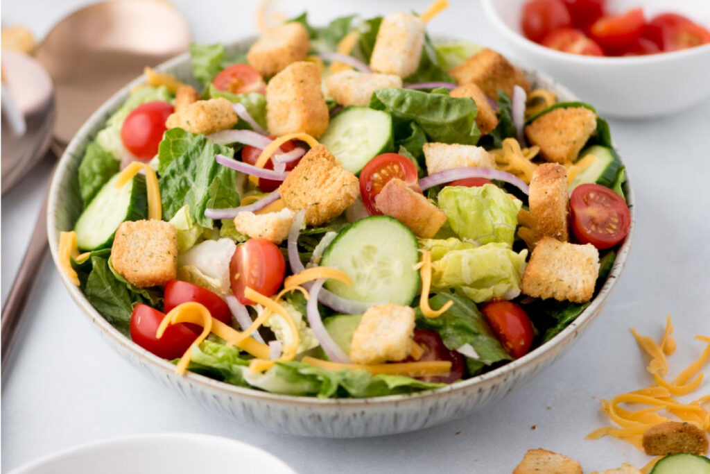 Fresh mixed greens topped with heirloom cherry tomatoes, crisp croutons, shredded carrots and cucumbers.